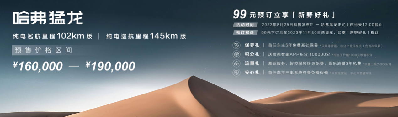 作为哈弗新能源在2023年的第二款战略级产品,哈弗猛龙将进一步巩固哈弗在新能源SUV市场的领导地位,并以实际行动践行“做每个时代最好SUV”的使命愿景。从燃油时代到新能源时代,哈弗一直致力让SUV产品普及化,让越来越多的消费者以溢价体验的科技平权,享受到更好的越野体验。哈弗猛龙将与枭龙系列一起成为哈弗新能源的两头猛兽,加速完善龙序列产品矩阵。