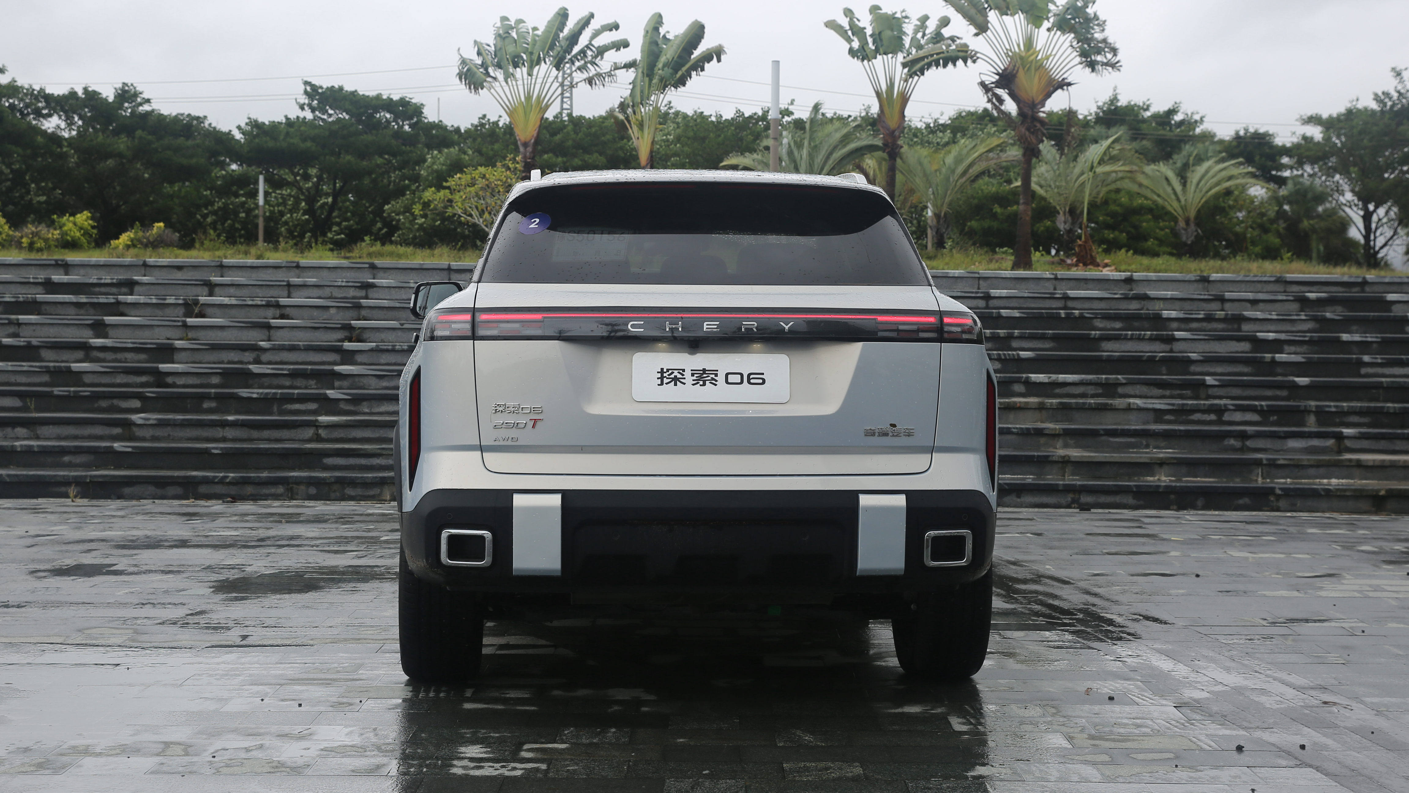 或许是出于越野SUV的定位考虑,探索06硬朗的尾部设计整体侧重于提高视觉高度和宽度。新车的贯穿式尾灯不仅同样极具数字感,并且也和车头的日间行车灯形成了呼应。黑色的后保险杠则采用了与车身同色的方块造型饰板以及同样是方形的双出排气装饰进行点缀。