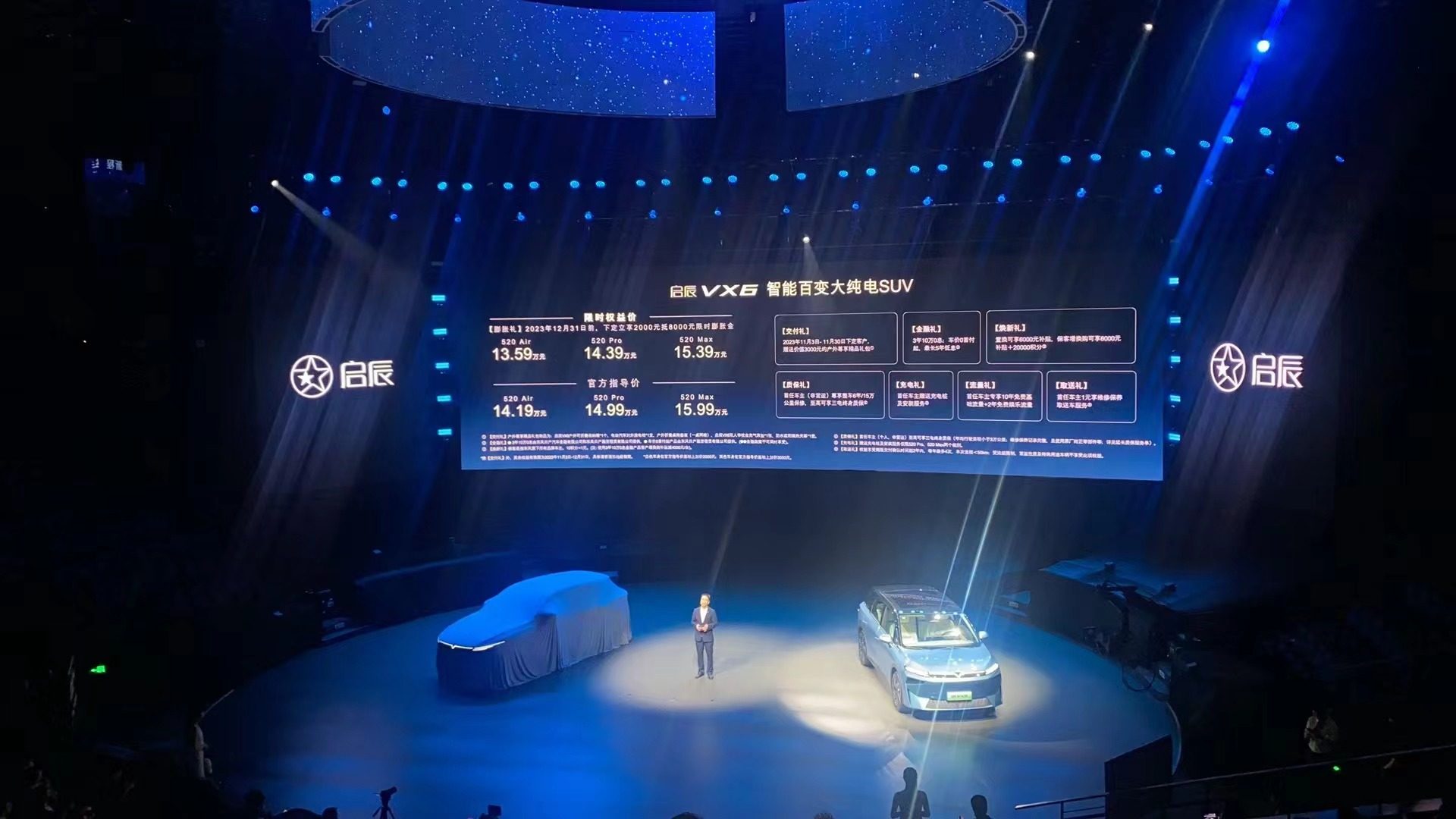 所以这就是我们今天要介绍的启辰VX6了。这款车是启辰的纯电平台架构下的第一款车,也是启辰这个品牌的第一款纯电车,今年9月底已经在广州的工厂下线了,11月3日晚上已正式上市,指导价14.19-15.99万元。