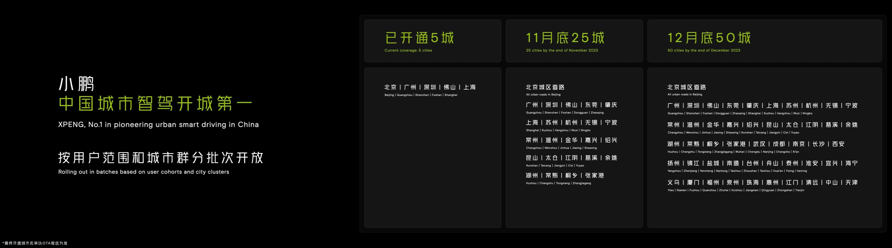 此外,小鹏汽车XNGP全场景智能辅助驾驶系统,作为国内首个落地无图城市智驾的方案,也迎来最新量产落地计划。本月底城市NGP版图将覆盖至25城,12月底将开放至50城,计划至2024年将在全国扩充至200城。而且,“开城”及“AI代驾”两种模式将同步进行,“AI代驾”年内向部分用户开放,2024年完成全国有所区域的城市高阶智驾覆盖。