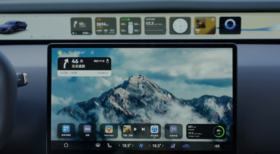 阿维塔12这次的内饰设计并没有选择套娃,它和阿维塔11完全就是两种风格。而让人瞩目的就是中控图上的超长屏幕,里面涵盖了车辆信息的卡片以及传统仪表盘位置的信息。