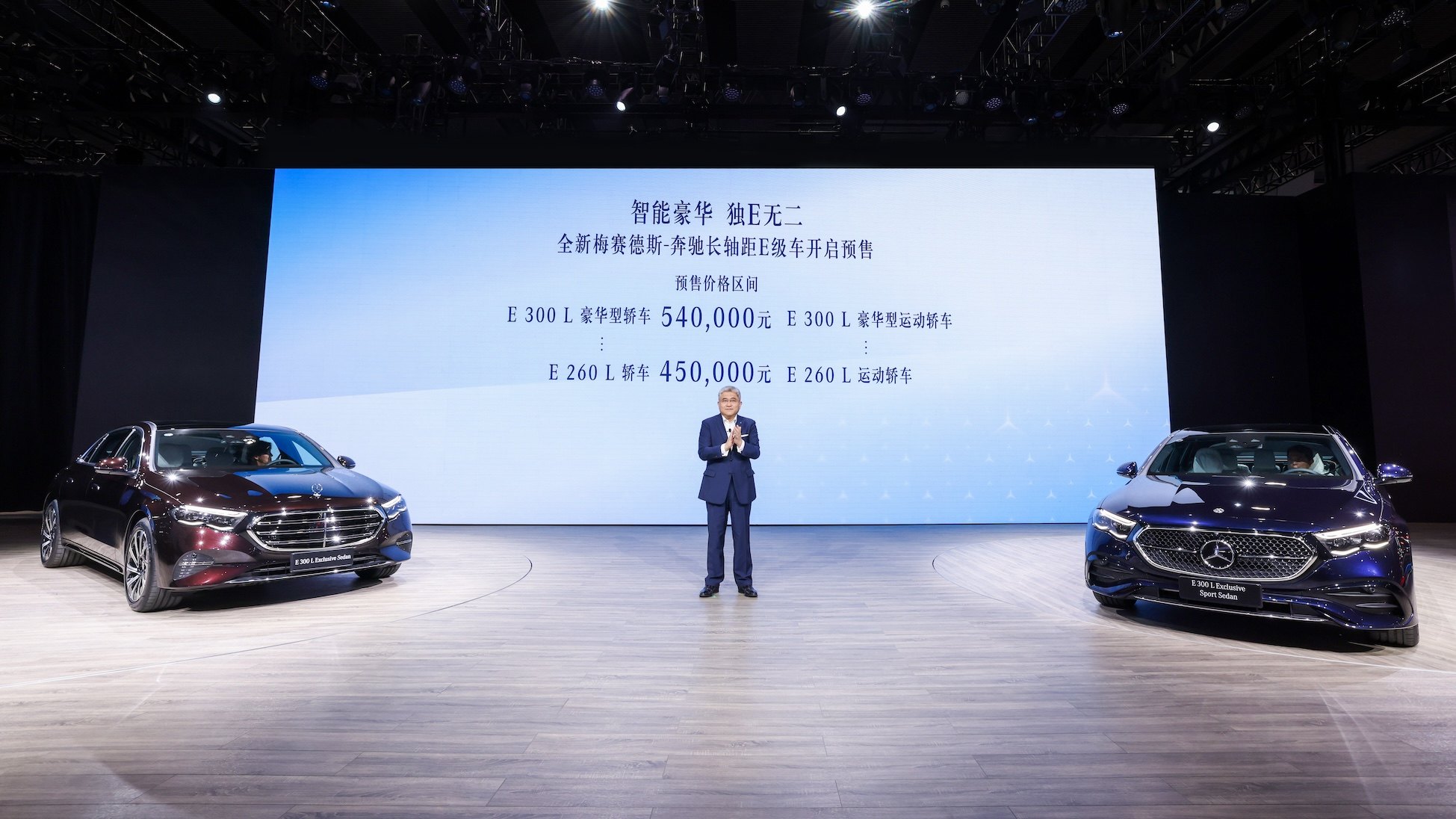 【2023年11月17日,广州讯】今日,全新梅赛德斯-奔驰长轴距E级车在中国市场正式预售,并于即日起开启多城预赏:E 260 L轿车/运动轿车预售价格区间为45万元至47万元,E 300 L时尚型轿车/运动轿车预售价格区间为50万元至52万元,E 300 L豪华型轿车/运动轿车预售价格区间为53万元至54万元。作为E级车换代之作,全新长轴距E级车集梅赛德斯-奔驰设计美学、豪华尊享、安全品质之大成,它延续经典的双车身设计,空间尺寸全面进化,修长车身更显大气;沉浸式智享座舱搭载全新MBUX超级屏,结合超过10项中国专属豪华增配,重塑数字时代座舱尊享的质感标准。作为首款搭载高通8295智能座舱芯片的豪华座驾,全新长轴距E级车首次采用梅赛德斯-奔驰第三代MBUX智能人机交互系统以及首款L2+级导航辅助驾驶系统,以强大的硬件实力赋能人机交互与自动驾驶,带来便捷顺畅、安全可靠的智舱与智驾体验,它不只是豪华新一代,更是深刻洞察中国社会中坚力量需求的智能豪华新一代。