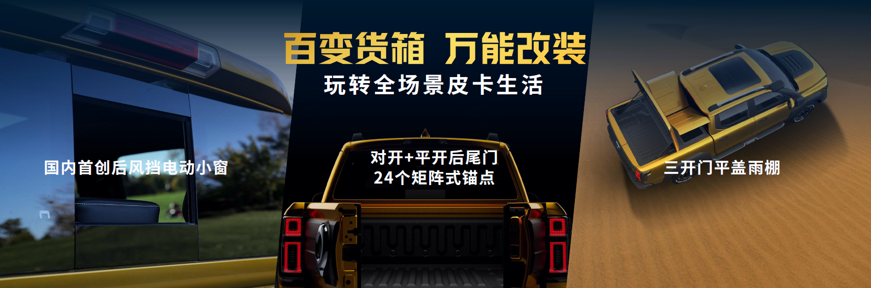更好玩,解锁无限生活可能。山海炮性能版国内首创后风挡电动小窗、对开+平开后尾门等人性化设计,首创三开门平盖雨棚,自带C6拖挂牵引资质,满足3.3吨拖车认证,玩转全场景皮卡车生活。