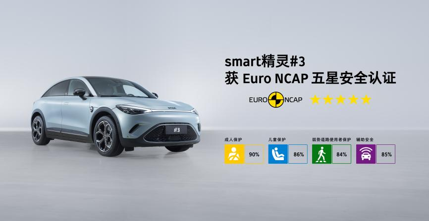 (2023年12月6日,杭州)今日,“全球新奢轿跑SUV” smart精灵#3获得欧洲新车安全评鉴协会Euro NCAP“五星安全认证”(2023新规)。在成人保护、儿童保护、弱势道路使用者保护以及辅助安全四项测试中,smart精灵#3得分率分别为90%、86%、84%、85%,均超越欧洲五星要求,总成绩及成人保护位列小型车第一。值得一提的是,smart精灵#3也是2023年所有测评车型中,安全辅助成绩最佳的车型。