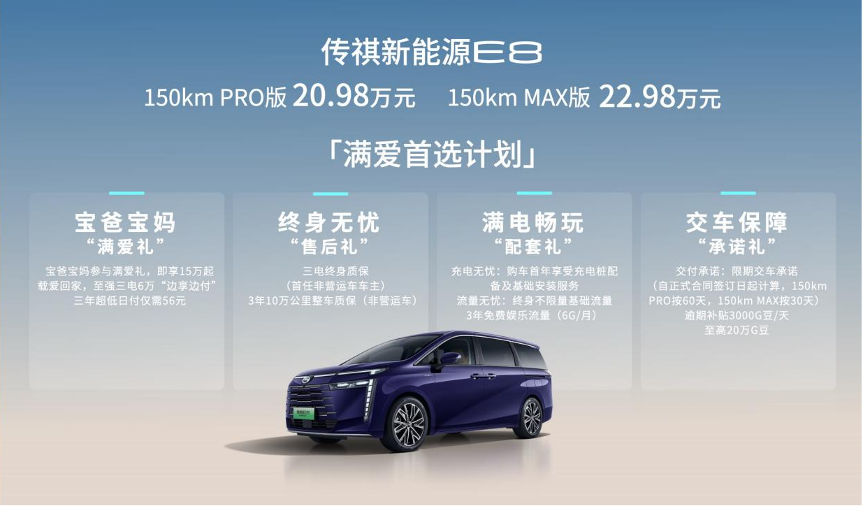 为了让更多预算有限的“宝爸宝妈”轻松升级拥有传祺新能源E8,广汽传祺福利加码,将“满爱首选计划”延长至2024年农历新年,仅需15万起就能将车开回家。