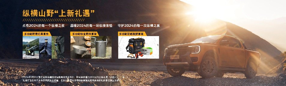 1月31日前购买野地、探迹、山林版的新车主在“纵横山野计划”之外,还将额外享受纵横山野“上新礼遇”。即日起,在全国各地的福特纵横纵享空间将开启全新一代福特游骑侠Ranger 1st Edition首发版的交付。2024年1月将开启全新一代福特游骑侠Ranger全系交付。