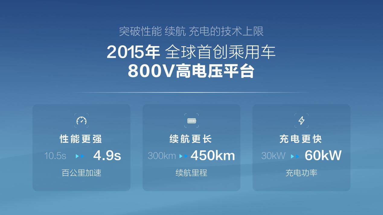 在新能源汽车普及初期,为了突破动力、续航、充电等方面的技术上限,给用户创造更极致的电动车体验,电动车高压化的技术突破势在必行。比亚迪率先在2015年实现突破,全球首创乘用车800V高电压平台,搭载在秦EV(2015款)、唐DM(2015款)等车型上。该技术可实现百公里加速快至4秒级,纯电续航里程可达450km、快充功率提升至60kW,全方面升维用户体验,超前行业2-3代。当时,市面上的乘用车都是低电压,只有比亚迪是高电压,时至今日,行业竞相进入800V高电压平台赛道。