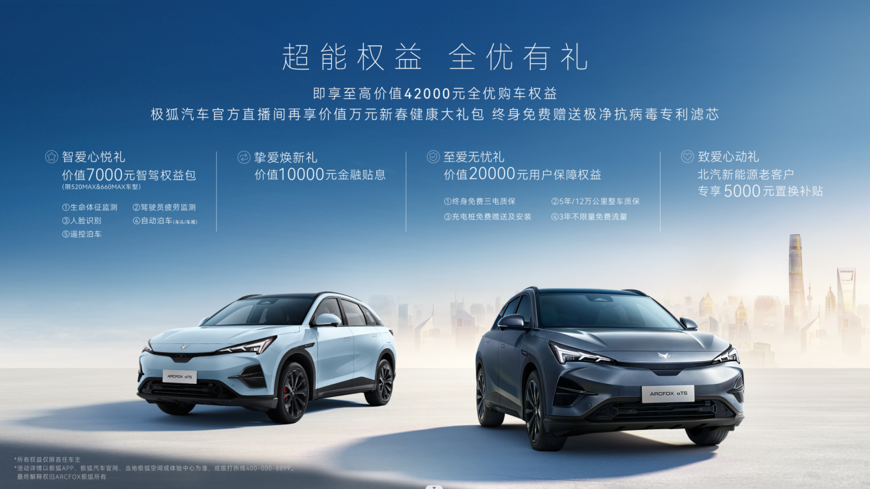 12月27日,极狐阿尔法T5正式上市,官方指导价15.58-19.98万元。4款版型与预售价相比,除入门款价格保持不变外,其余3款均比预售时低了4000元,分别为520AIR 15.58万元、520PRO 16.38万元、520MAX 17.58万元、660MAX 19.98万元。同时,官方推出了至高价值42000元的全优购车权益,包括价值7000元的智爱心悦礼;价值10000元的挚爱焕新礼;价值20000元的至爱无忧礼以及老客户专享5000元的致爱心动礼,诚意满满,吸引力更足。