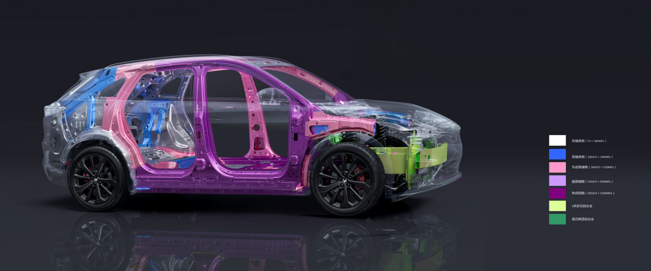 如果说健康,极狐已经做到了天花板。那么安全,也是极狐家族基因。阿尔法T5打造了天花板级铠甲车身,高强度钢和铝合金车身占比高达81.0%,在热成型钢比例上,行业平均水平是15%,以安全著称的沃尔沃XC40是20%,而阿尔法T5达到了30.08%,材料强度达到1500 MPa,所有涉及到车内乘员保护的关键零件的壁厚都做了加强,有的甚至加强了30%-50%,车身抗扭刚度更是达到了天花板级的47119Nm/deg,最大程度保持乘员舱完整性,保护车内乘员的安全。