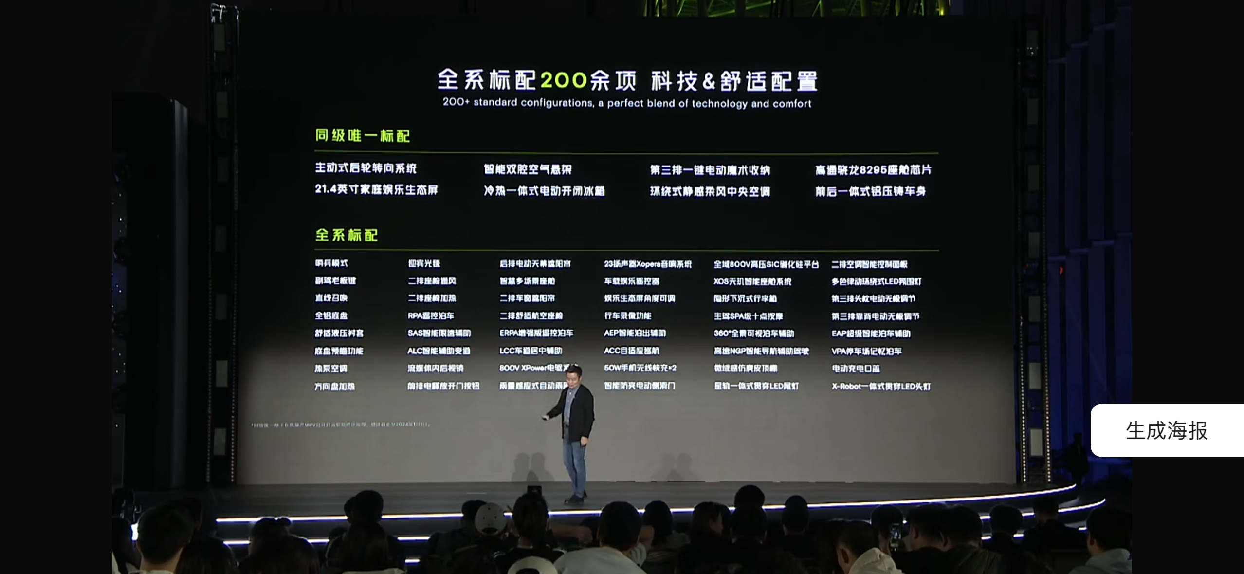 再说车内,这台小鹏X9的布局继续延续了家族式的设计,并且成为首款搭载XOS天玑智能座舱系统的车型,悬浮式中控屏中置,两幅式方向盘让人眼前一亮,特别是放置在左上缩小的小鹏logo,还有环绕式氛围灯以及双50W无线充电,整台车采用了2+2+3的布局,第二排的航空座椅需要选配,选完当然乘坐体验可以得到提升,但是进入第三排就需要折叠座椅才可以进入了,并且小鹏X9同样搭载了“空调冰箱”,第二排提供21.4英寸家庭娱乐生态屏,全车23个扬声器的Xopera音响系统以及冷热一体电动开闭冰箱和零重力座椅!新车套内面积7.7平方米,第三排还配备了电动魔术折叠功能,折叠后可以得到1846L的后备箱空间,这让这台MPV的空间在坐下7个人的情况下还可以每人带一只24英寸的行李箱上车。