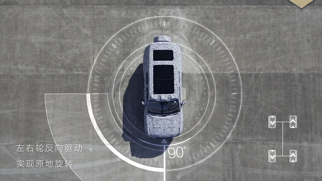 由四台驱动电机组成的动力布局意味着这些车型的每一个车轮都配备独立的动力源,有了四轮独立的动力,才有可能实现让两侧车轮以相反方向运转的操作。