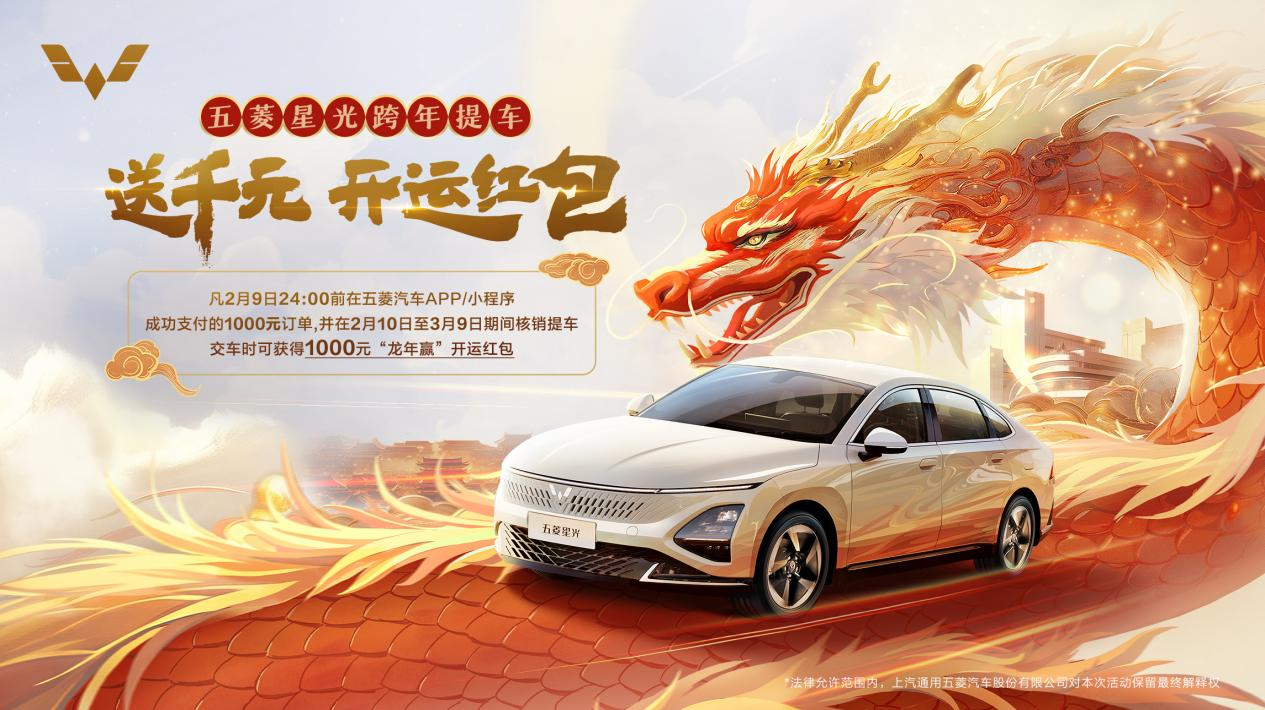 开五菱,龙年赢!为感谢用户对五菱星光的喜爱和信任,凡在2024年2月9日(含)前在五菱汽车APP或小程序成功支付的1000元订单,并在2月10日至3月9日(含)期间核销提车的用户,交车时可享1000元“龙年赢”开运红包。