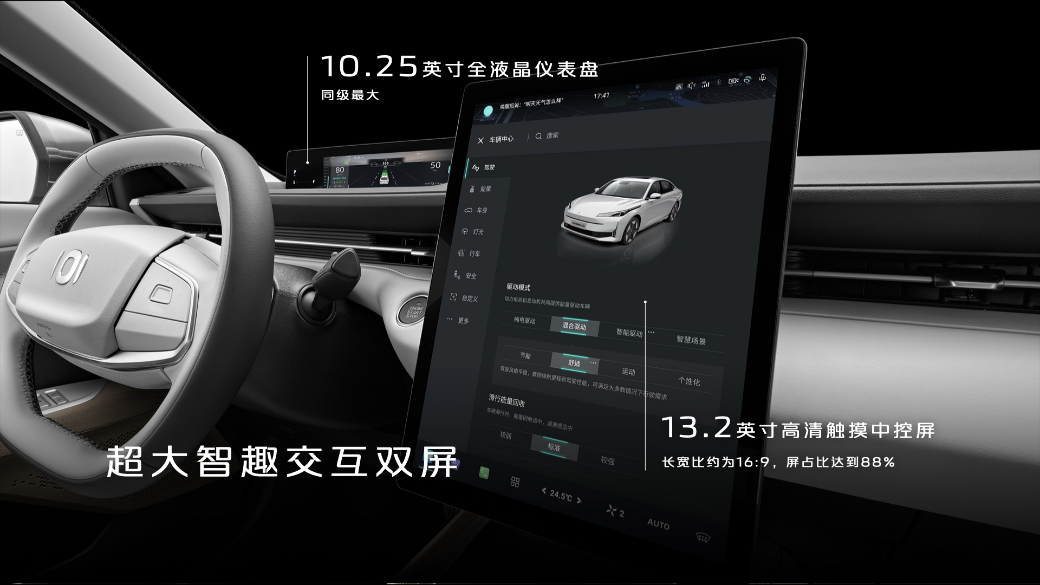 在数智科技配置方面,长安启源A05同样超乎用户期待。车载“AI小安”智能语音系统,语音识别率高达95%。生态服务更丰富、人车交互更便捷的讯飞飞鱼OS4.0系统,给用户带来了更加精彩的汽车生活体验。10.25英寸全液晶仪表与13.2英寸高清触摸中控屏,组成了超大智趣交互双屏,让用户轻松解锁更多用车场景。