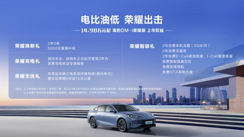 伴随宋PLUS荣耀版、海豹DM-i荣耀版的上市,比亚迪还准备了多重购车礼遇,自上市之日至3月31日24:00前完成购车开票,购买宋PLUS荣耀版可享2年0息、4000元置换补贴、全系2年免费云服务和车机流量(5GB/月)等多重礼遇。