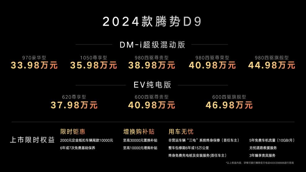 3月6日,2024款腾势D9正式上市,新款腾势D9 DM-i超级混动版官方指导价33.98万元-44.98万元,新款腾势D9纯电版官方指导价37.98万元-46.98万元。并推出2000元定金抵扣车辆尾款10000元,6年或7次免费基础保养,至高30000元置换补贴,至高10000元增购补贴,限时金融贴息,三年臻享贵宾服务,四大用车保障,五大尊享智联等上市权益。针对老用户也推出了30000元置换补贴,贵宾服务权益转移,10000元增购补贴,2000元延保补贴,4000元量子漆面保护膜补贴等感恩回馈。