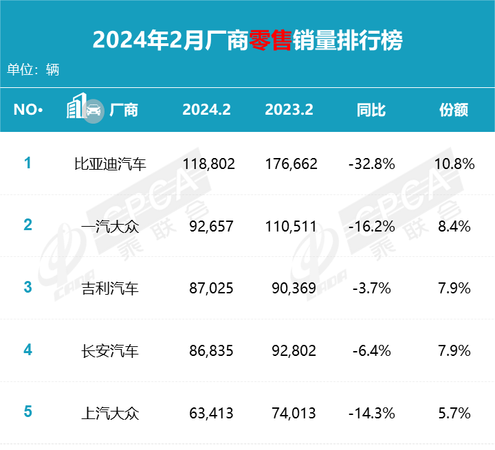 2月份比亚迪的零售销量依旧遥遥领先,它一共销售了118802辆新车,在国内有着10.8%的市场份额。然而,体量最大的“迪王”同样受到深受低迷的市场影响也最大,它在2月份的销量同比下滑高达32.8%,是国内销量下滑最严重的中国车企之一。