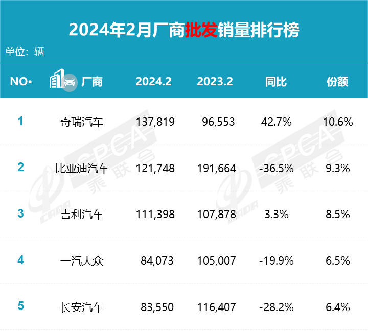 如果我们稍微翻一下乘联会同时公布的批发销量排行榜就会发现,奇瑞汽车2月份的批发销量高达137819辆,是批发销量排行榜当之无愧的霸主,但它在国内的零售销量却只有57089辆,只能屈居第六。