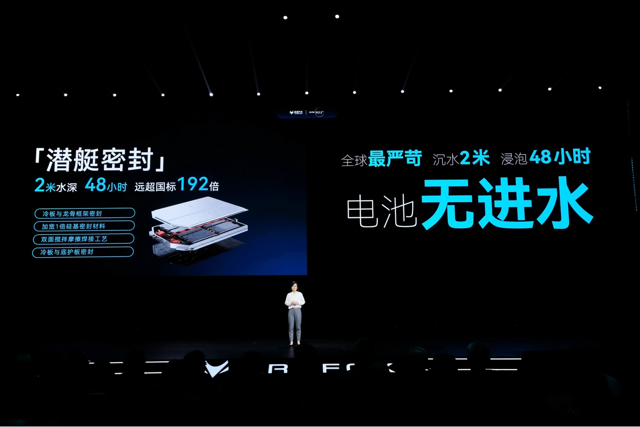 电池底部标配加装了独创的“玄武护甲”,这个护甲运用航天级的材料及工艺,形成了7层防护,强度达到1500MPa,堪比装甲车,还兼顾了绝缘、保温、导热、防腐等四大功能,充分考虑到环境的复杂性。此外,极光电池开创的“太空舱密封”技术。选择高疏水性的硅基材料作为基材,疏水率达97%,在2米水深,48小时淹没测试条件下,滴水未进,堪称电池界的潜水艇,远超行业平均水平。在玄武护甲和太空舱密封的超强防护下,不论遇到多么复杂的路况和环境,极狐汽车都可以放心的开。
