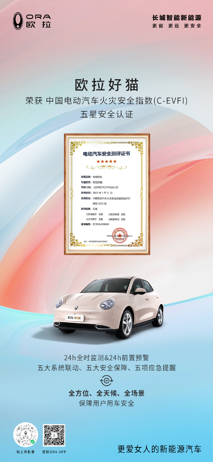 在用户十分关注的电气安全上,2024款欧拉好猫依旧不遗余力,整车416项整车电安全防护、24小时全时监测&24小时前置预警,五大系统联动等举措,给予用户更踏实的安全感。而中国电动汽车火灾安全指数(C-EVFI)五星安全评价的加持,进一步印证了欧拉好猫在安全方面的过硬实力。