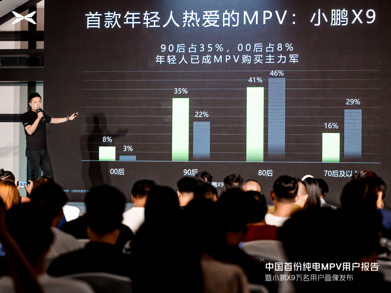 曾几何时,“能油能电”的增程新能源产品成为不少奶爸挑选的家庭座驾,然而数据显示,高达25%的小鹏X9的新能源增换购人群正是从增程车型用户转换过来的。既然奶爸群体对小鹏X9青睐有加,代表小鹏X9的用户群体偏向年轻化,其中80后占比达到41%,90后占比达到35%,这一数字出乎所有人的意料。在大量用户对MPV还停留在商务车认知时,年轻人已经悄然开始接受纯电MPV。