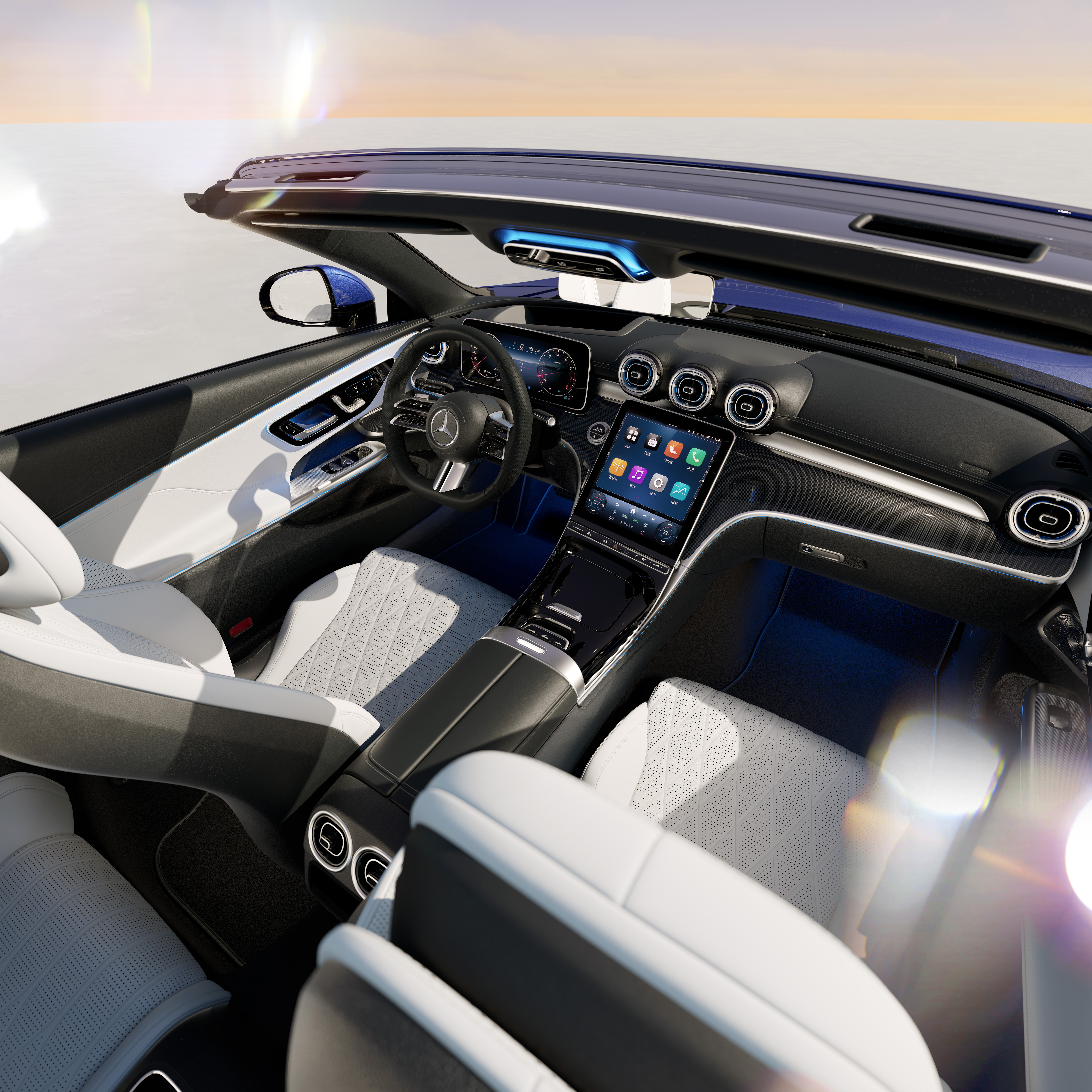 进入车内,匠心独运的座舱别具韵味。车门、屏幕均采用悬浮感内饰设计,搭配优美的曲面造型,使座舱充满艺术美感。Nappa皮饰多功能运动型方向盘手感精致,可加热前排座椅配合安全带递送器,让每一次入座都成为一种享受。奔驰标志性的64色环境氛围照明系统,配以Burmester® 3D环绕立体声音响系统,带来沉浸式视听盛宴,雾霾终结者3.0能高效净化车内空气,关闭敞篷即享清新之境。