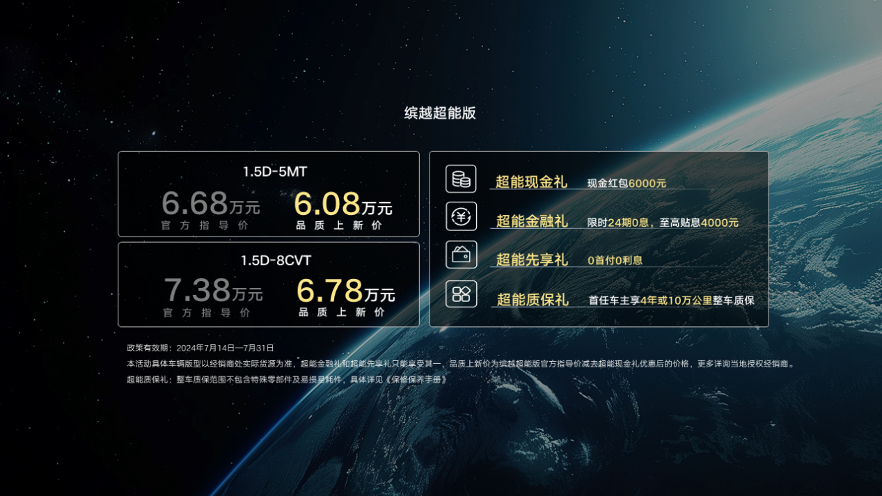 7月14日,在吉利缤越全球总销量突破90万辆之际,吉利汽车旗下A0级冠军SUV “缤越超能版”在吉利汽车湘潭基地上市,新车是“缤越家族”新增的全新车型。新车共推出1.5D+5MT和1.5D+8CVT两种动力组合车型,官方指导价分别为6.68万元、7.38万元,享受6000元超能现金礼后的品质上新价分别为6.08万元、6.78万元。与此同时,吉利汽车还推出价值丰厚的购车福利,进一步降低品质车入手门槛。