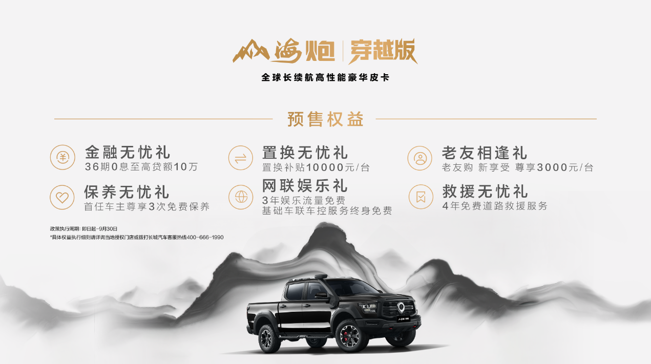 2.4T越野炮进阶版官方建议零售价17.88万元、高阶版官方建议零售价18.88万元,购车用户还可尊享“现金礼、置换礼、服务礼、金融礼、老友礼、互联礼”六重大礼;山海炮穿越版预售价24.98万元,预订用户可尊享“金融礼、置换礼、老友礼、保养礼、网联娱乐礼、救援礼”六重大礼,价值拉满,诚意满满。