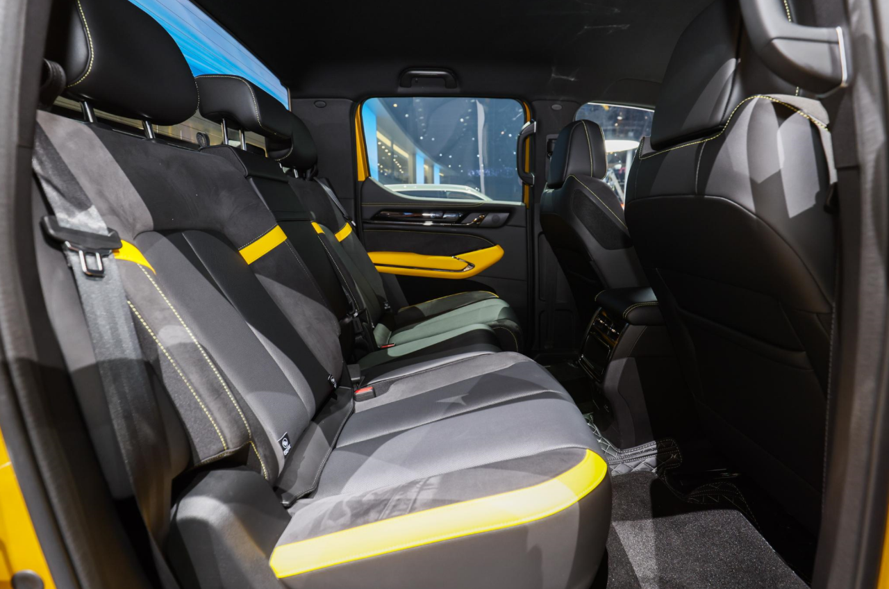 山海炮穿越版车长超5.4米,车宽近2米,大尺寸带来大空间,内部肘部宽度1.6米,乘坐空间更大、更舒适;皮卡首创后排座椅电动滑移及迎宾,最大靠背角度达33度,舒适度媲美大型豪华SUV;首创皮卡静音科技,通过后门缝后移、迷宫式出气口等多项创新及专利技术应用,100km/h座舱噪声低至66.1分贝,远超同价位SUV水平。