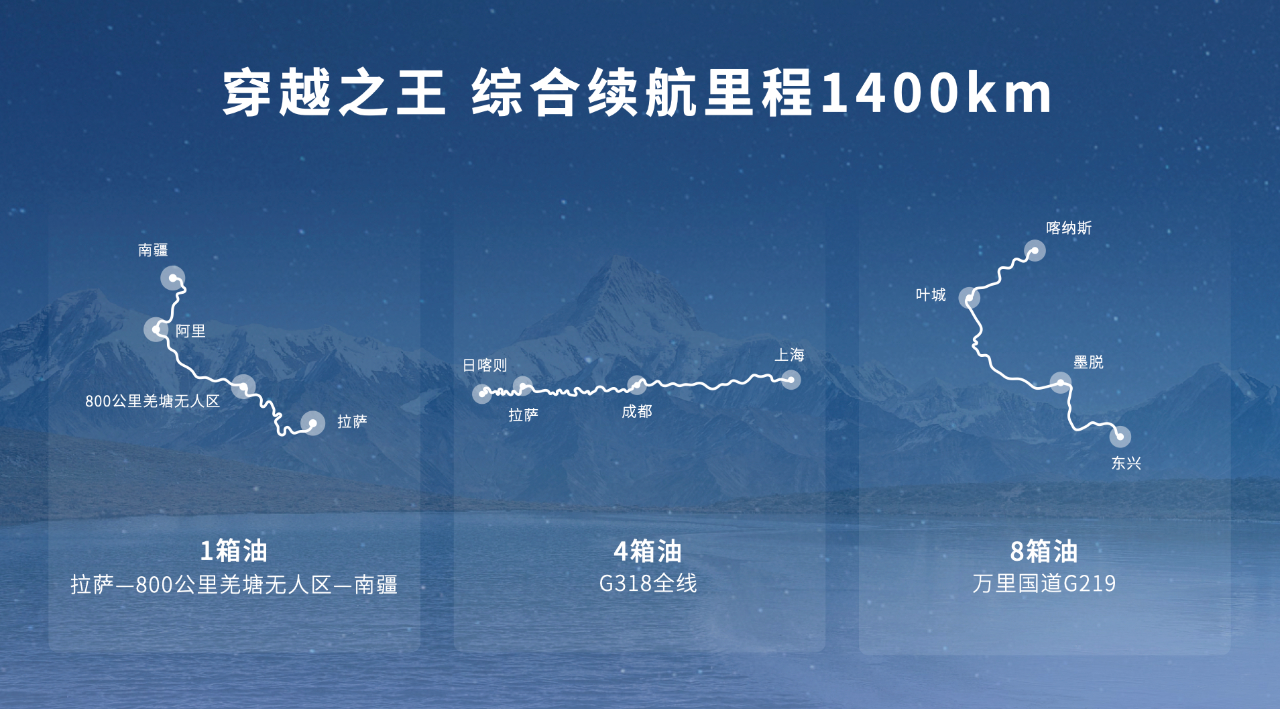 山海炮穿越版国产唯一原厂标配双油箱,主油箱78L、副油箱53L,均可独立供油、独立油显,综合续航可达1400公里,长途穿越抗风险能力更强,1箱油即可完成拉萨经800公里羌塘无人区至南疆的大穿越;4箱油即可完成穿越G318全线,8箱油即可穿越中国最长万里国道G219,是真正的穿越之王!