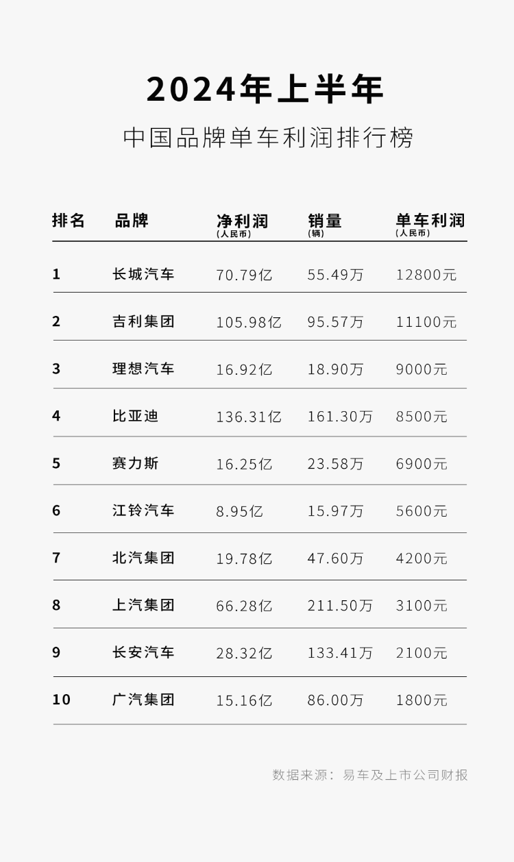 就在最近,2024上半年中国品牌单车利润排行榜新鲜出炉,而单车利润最高的中国品牌分别是长城、吉利、理想。