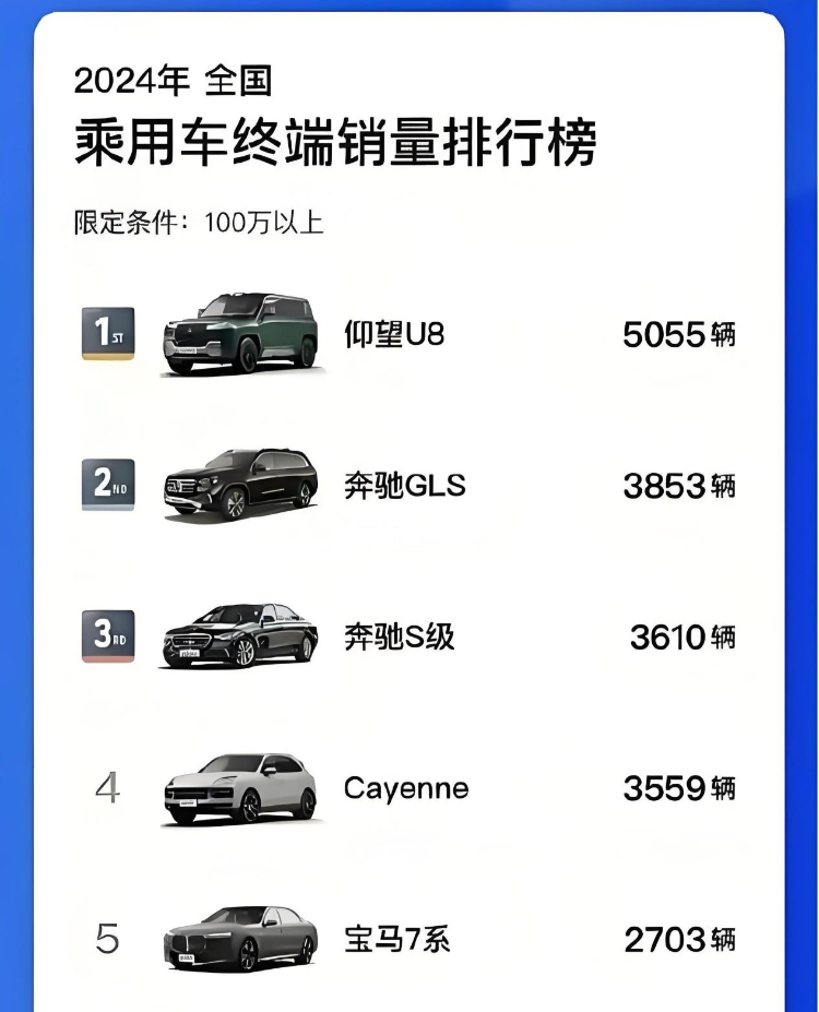 从前提起百万级豪车,别人肯定联想到的品牌都是BBA起步,以及保时捷、玛莎拉蒂等超豪华品牌,但现在仰望U8才是百万级豪车“霸榜”选手,2024年以来累计销量超5000台,比保时捷卡宴卖的还好。