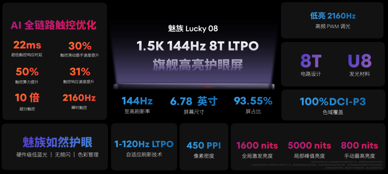 为了给手机用户带来更好的屏幕视觉效果,魅族 Lucky 08 采用一块 6.78 英寸 8T LTPO 144Hz 1.5K 高分辨率旗舰护眼直屏,峰值亮度达到 5000 nits,在户外强光底下也依然清晰可见,搭配全面优化的 AI 全链路触控技术,响应速度提升 50%,并达到 10 倍超分触控体验。