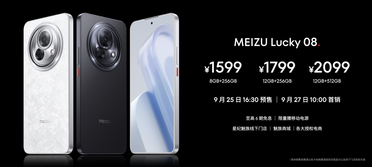 魅族 Lucky 08 拥有星耀白、陨石黑两种配色,其中 8GB+256GB 版本售价 1599 元、12GB+256GB 版本售价 1799 元、12GB+512GB 版本售价 2099 元,购买可享至高 6 期免息。