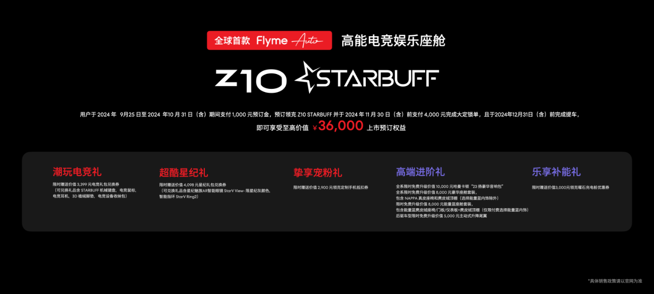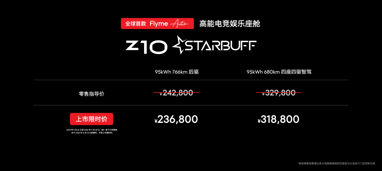发布会上,星纪魅族与领克联合打造的 Z10 电竞定制版车型正式上市,分为 Z10 STARBUFF 95kWh 766km 和 Z10 STARBUFF 95kWh 680km 后驱版两个配置,零售指导价分别为 24.28 万元、32.98 万元;上市限时价分别为23.68万元、31.88万元。11 月 30 日前完成大定锁单,并于 12 月 31 日前完成提车的用户可享受上市限时价。