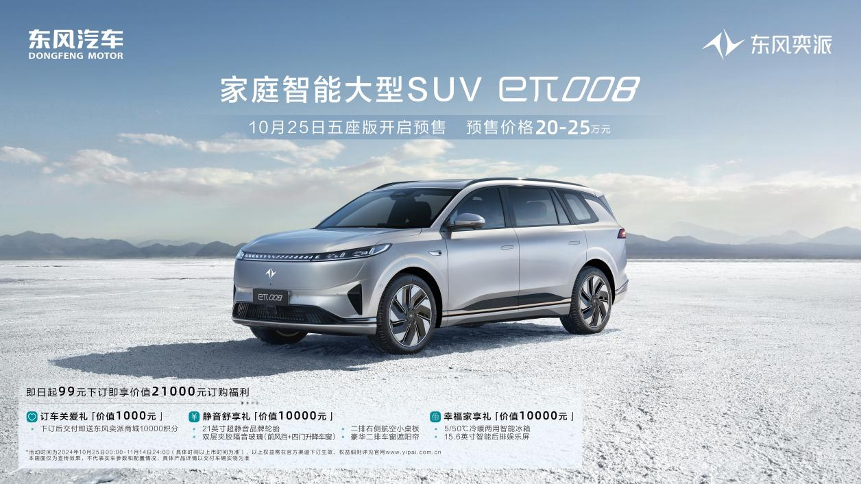 汽车圈精彩连连,大事不断!10月25日,东风奕派eπ008五座版首发亮相。全能艺人韩庚作为东风奕派品牌体验官现身官方直播间,与东风奕派营销事业部总经理余飞一同见证新车预售发布。直播现场,官方公布eπ008五座版预售价区间20-25万元,即日起99元下订还可享价值21000元订购福利,包括价值1000元订车关爱礼和价值20000元的静音舒享礼、幸福家享礼。