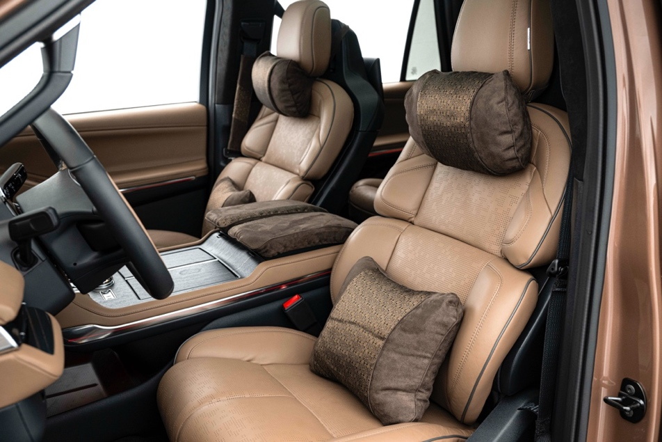 超大空间,统帅姿态挥斥方遒 惬意之道,统帅王者征途。基于中国用户需求,全新一代林肯领航员首次在二排引入复式大沙发 —— “统帅座”,全车座椅采用苏格兰Bridge of Weir专门为林肯领航员车型研发的Opulence皮质打造,融入加热、通风、按摩等功能,搭配专属的全尺寸中央吧台,二排控制屏与无线充电,让后排乘客也能享受如头等舱般的统帅坐姿体验。近 2 米的车高允许二排统帅座的坐高设置到近 1 米,确保前后排乘客窗外视野不受阻挡,“统帅视线”尽收广阔天地,一览众山小。再配合48英寸环抱式4K超高清显示屏和“焕活舒享”一键式全体感车内SPA体验,身处车内,所触所感尽是巅峰美式豪华的魅力。