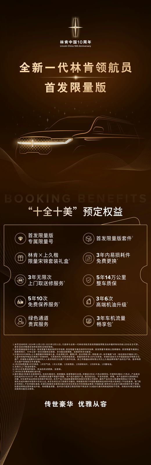 林肯为全新一代林肯领航员首发限量版车主提供价值超十万元的“十全十美”*专属预定权益,涵盖专属套件设计、专属礼盒、专属服务等,为车主带来尊享无忧的豪华用车体验。