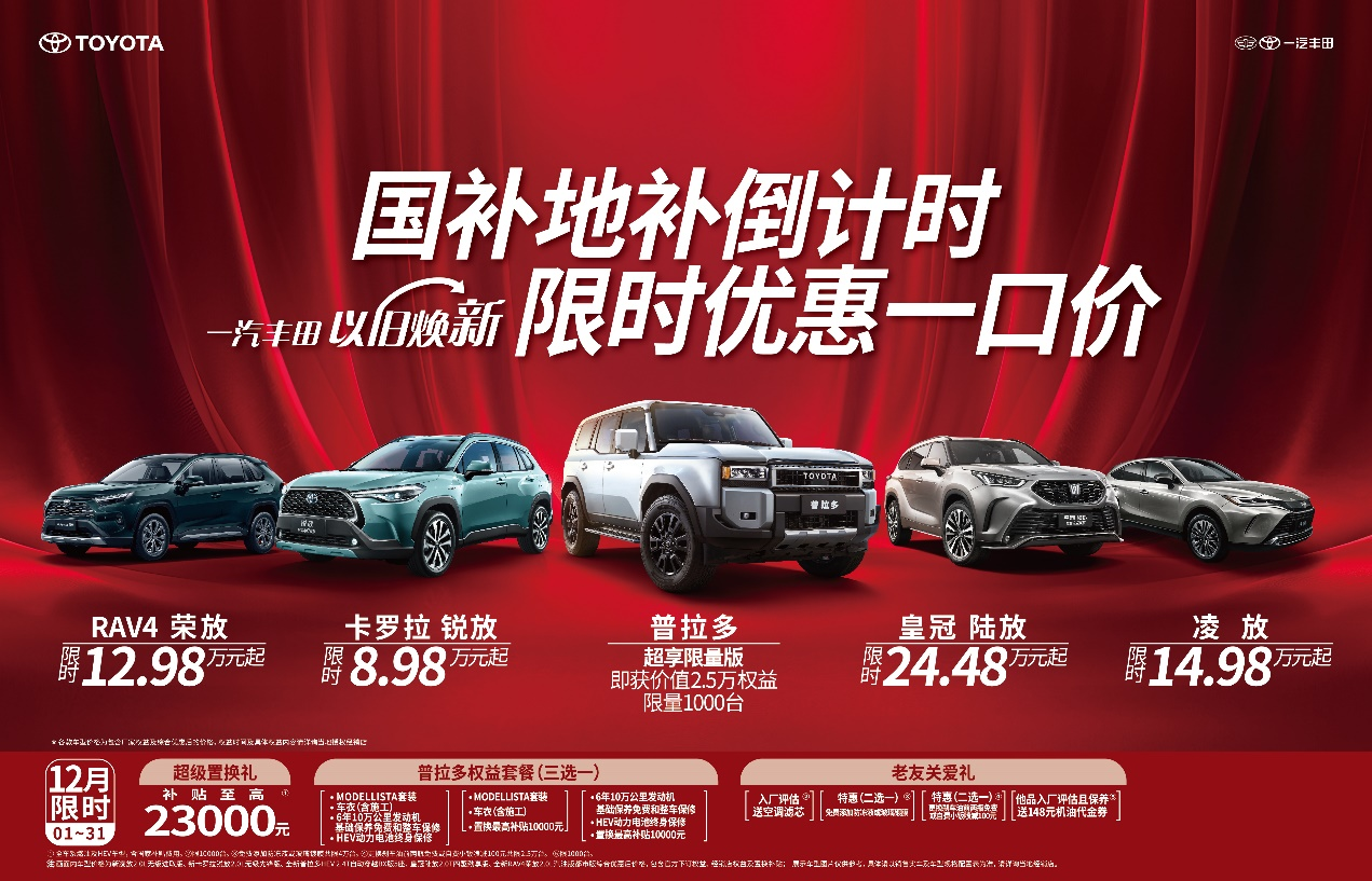 面向全年销售目标及份额挑战, 12月1日-31日,一汽丰田“国补地补倒计时 以旧焕新限时优惠一口价”活动开启,至高可享2.3万超级置换补贴,另有丰厚入厂、保养礼品及多重金融政策,助力用户梦想成真。旗下传奇硬派越野SUV全新普拉多超享限量版官方APP下订即享价值2.5万元权益,限量1000台先到先得;悦享活力SUV卡罗拉锐放限时8.98万元起;豪华大七座SUV皇冠陆放限时24.48万元起;全能SUV RAV4荣放限时12.98万元起;轻奢都市SUV HARRIER凌放限时14.98万元起,价格直降优惠幅度空前,最佳购车时机不容错过。