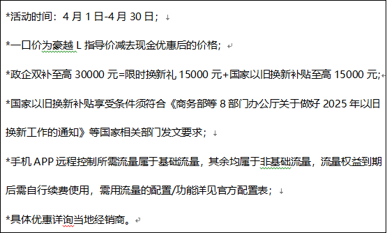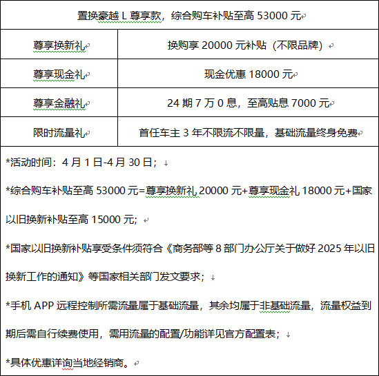 凭借灵活大空间、智能座舱、2.0TD豪华动力等优势,豪越L在大7座SUV市场展现出极强的竞争力,无论是多口之家的日常通勤,还是周末露营、长途自驾,它都能提供越级的舒适体验。4月购车正当时!豪越L以“全系一口价+至高53000元补贴”的诚意政策,进一步满足广大用户对高品质出行生活的追求。如果你正在寻找一款空间大、动力强、高品质高且价格亲民的大7座SUV,豪越L绝对是不二之选!
