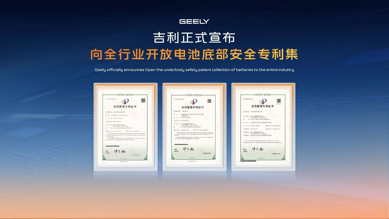 在吉利看来,安全专利不是“炫技工具”,而应当成为全行业共享的标准。针对电池新国标增加的底部碰撞试验,作为该项测试国家标准的主要参与者,吉利还将向全行业开放包含电池包底护板专利、电池包防撞梁专利、底部碰撞实验装置专利在内的电池底部安全专利集,为消费者与行业带来从整车电池安全设计与技术验证的系统性解决方案。