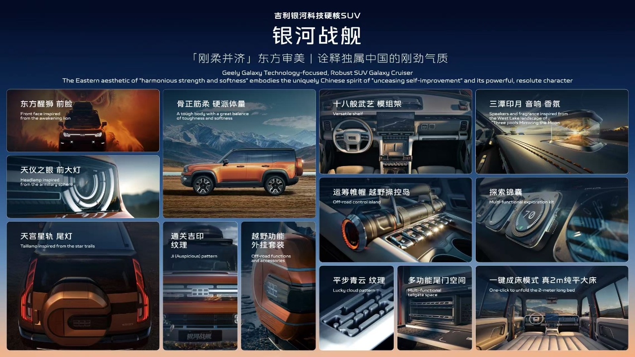 发布会上,吉利智能安全科技的集大成者——银河战舰迎来全球首发。银河战舰在设计上不仅展现了“刚柔并济”的东方审美,更诠释了独属于中国人“自强不息”的刚劲气质。形似“浑天仪”的前大灯、勾勒“天宫星轨”的尾灯,灵感来自“游艇操纵杆”的越野操控岛等设计等,均展现了吉利银河“涟漪美学”在智电时代的硬派表达。
