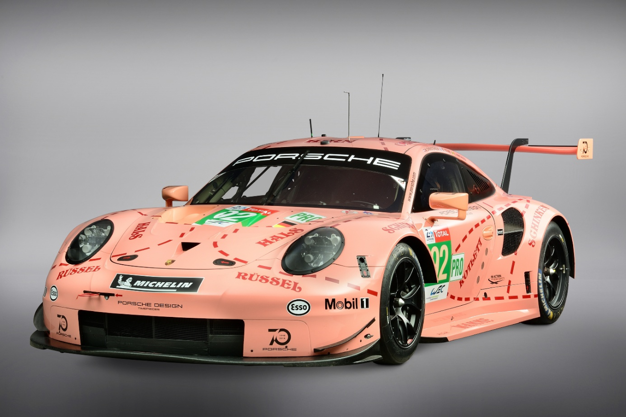 毫无疑问,这是一款现代化的赛车——911 RSR(991),其出征了 2018 年的勒芒 24 小时耐力赛 GTE-Pro 组别的角逐。最终这台身披“粉猪”涂装的 92 号 911 RSR 赛车在与法拉利、宝马、福特、克尔维特、阿斯顿·马丁五大制造商车队的同场竞技中斩获组别冠军。更值得一提的是,虽然未出现在展台,但身披乐富门涂装的 91 号911 RSR赛车斩获亚军,包揽组别前两名。这款“粉猪”涂装的 92 号 911 RSR 赛车不由令人想起保时捷 917/20 赛车征战 1971 年勒芒比赛时的情景。车身图案为粉色猪肉切割图的样式,这一由保时捷设计师 Anatole Lapine 提出的设计理念在当年的法国萨尔特省引起轰动。时至今日,被称做“松露猎人”的保时捷 917/20 赛车仍是最著名的保时捷赛车之一。