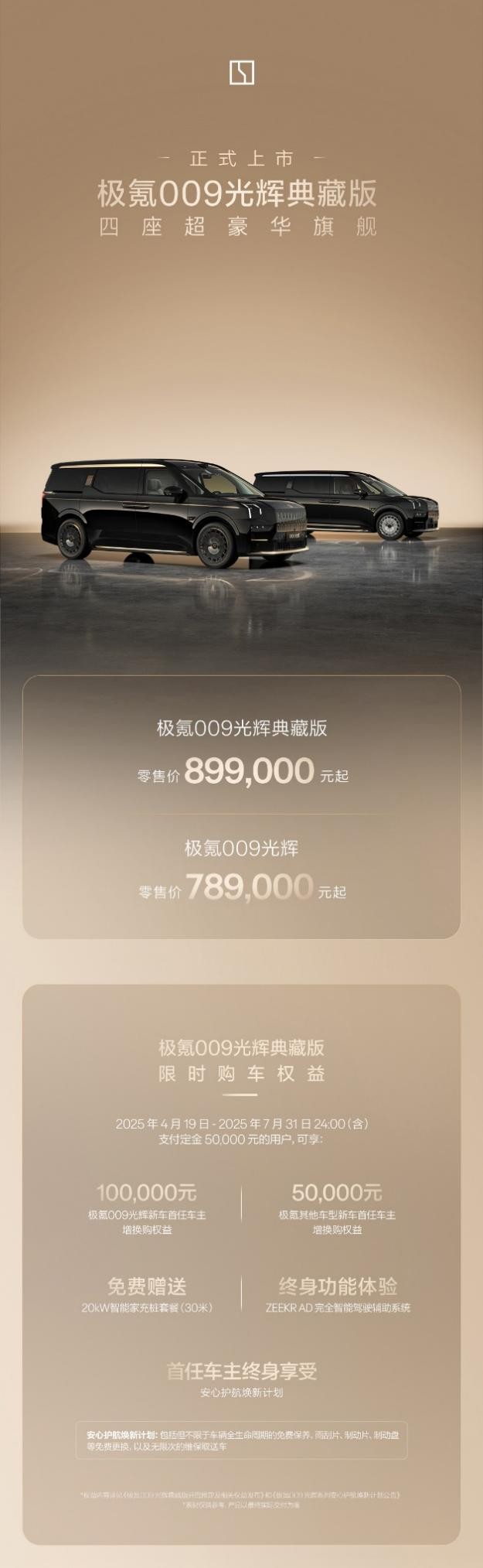 【2025年4月19日,嘉兴】今日,极氪品牌正式发布四座超豪华旗舰的特别版本——极氪009光辉典藏版,官方零售价为89.90万元起。即日起,用户可通过极氪App、极氪官网、极氪小程序、全国各大城市的极氪门店等官方渠道进行预定,并将于2025年6月开启全国交付。