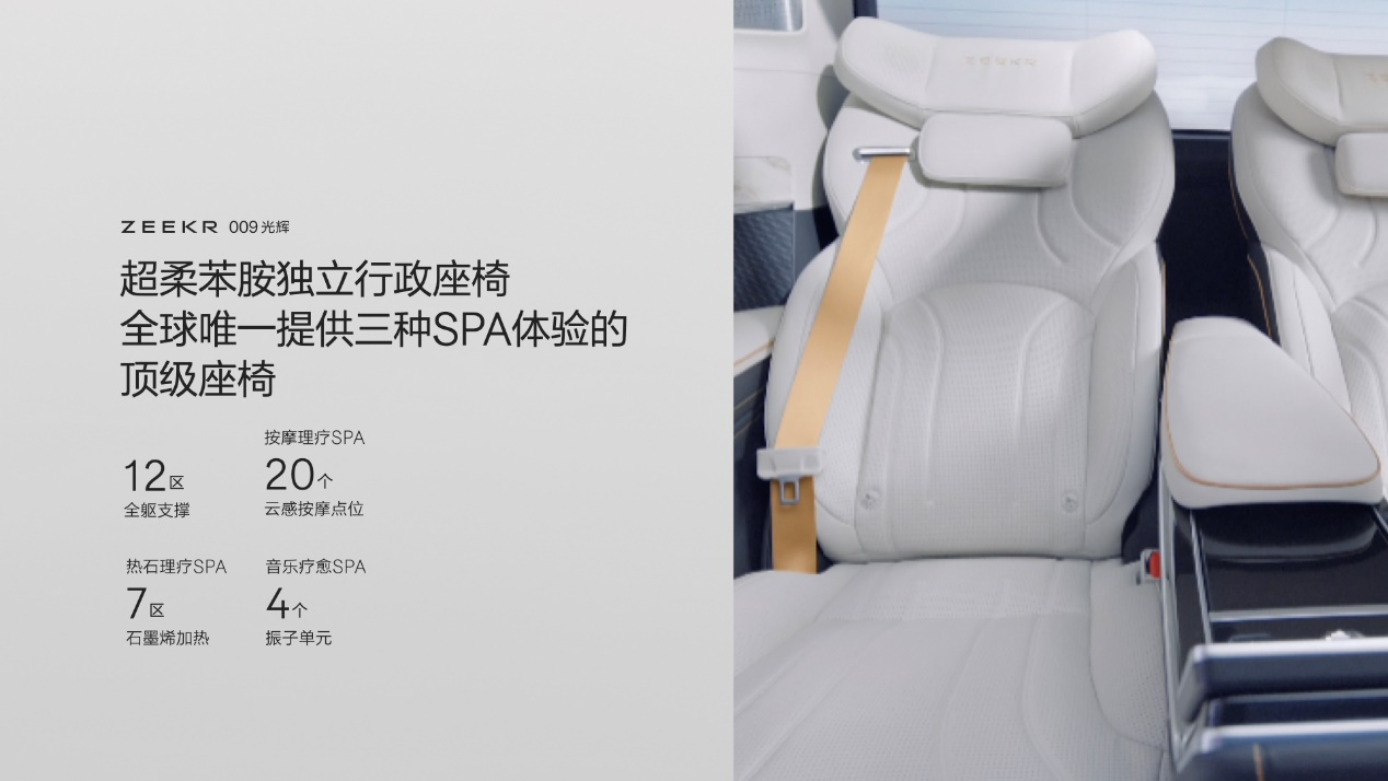 极氪009光辉不仅提供极致的安全守护,穿越时间的价值,还能创造让人心生愉悦的体验。价值50万一把的座椅,采用当前汽车行业最顶级的超柔苯胺真皮,与劳斯莱斯同源,都来自德国巴伐利亚没有围栏的天然牧场,而且经过严苛筛选后,最终能用于包覆座椅的优质皮料,只有不到3%。同时,这把独立行政座椅使用了11层结构以及12个区域的人体工学支撑,带来20个点位的按摩理疗,以及覆盖全身7个区域的石墨烯热石SPA体验。