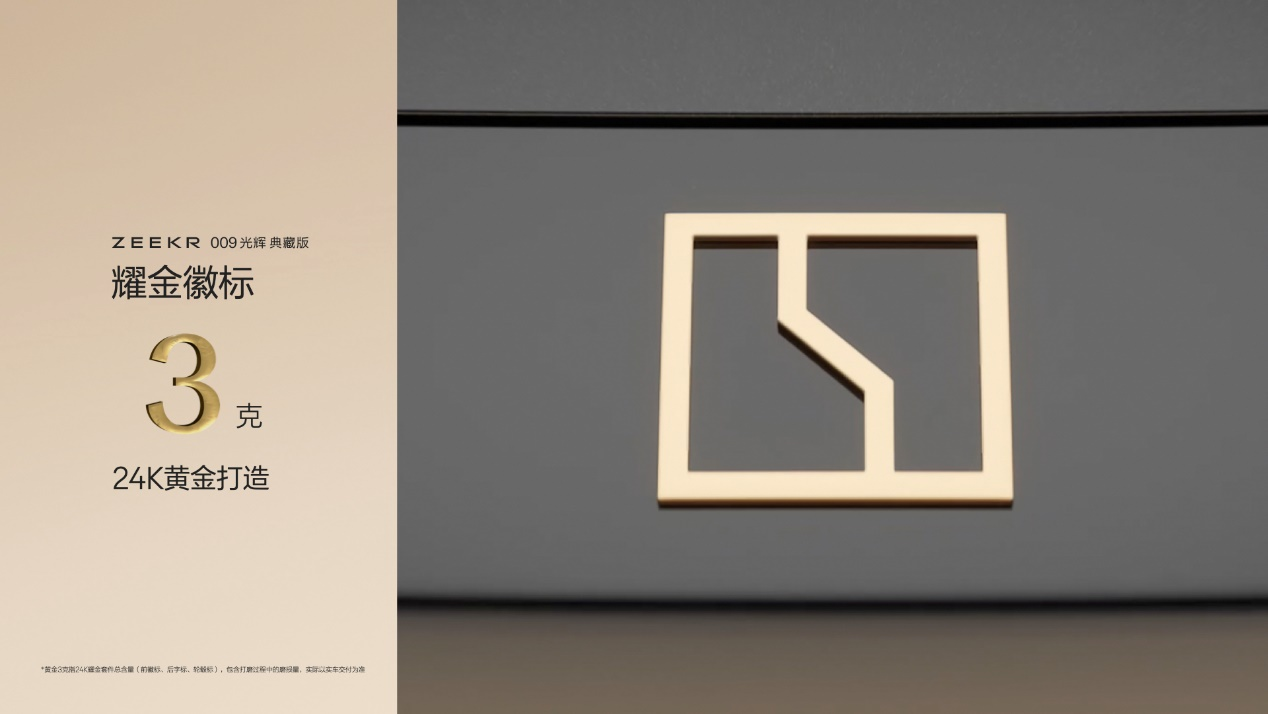 作为汽车中的奢侈品,极氪009光辉典藏版用黄金打造徽标,在车头、车尾以及轮毂上的7个徽标中,加入了3克24K黄金。金徽标在在黑色车身和耀黑金属格栅的映衬下格外醒目,不仅起到了画龙点睛的效果,也成为光辉用户独一无二的身份象征,也让极氪009光辉真正拥有了可以穿越时间的价值和值得典藏的意义。