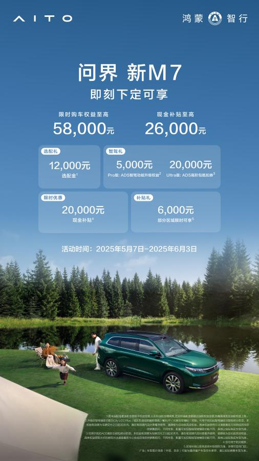 目前,问界官方还推出了重磅购车权益:即日起至6月3日下定问界新M7,至高可享价值58000元限时购车权益,及至高26000元现金补贴权益,进一步助力用户轻松购车。