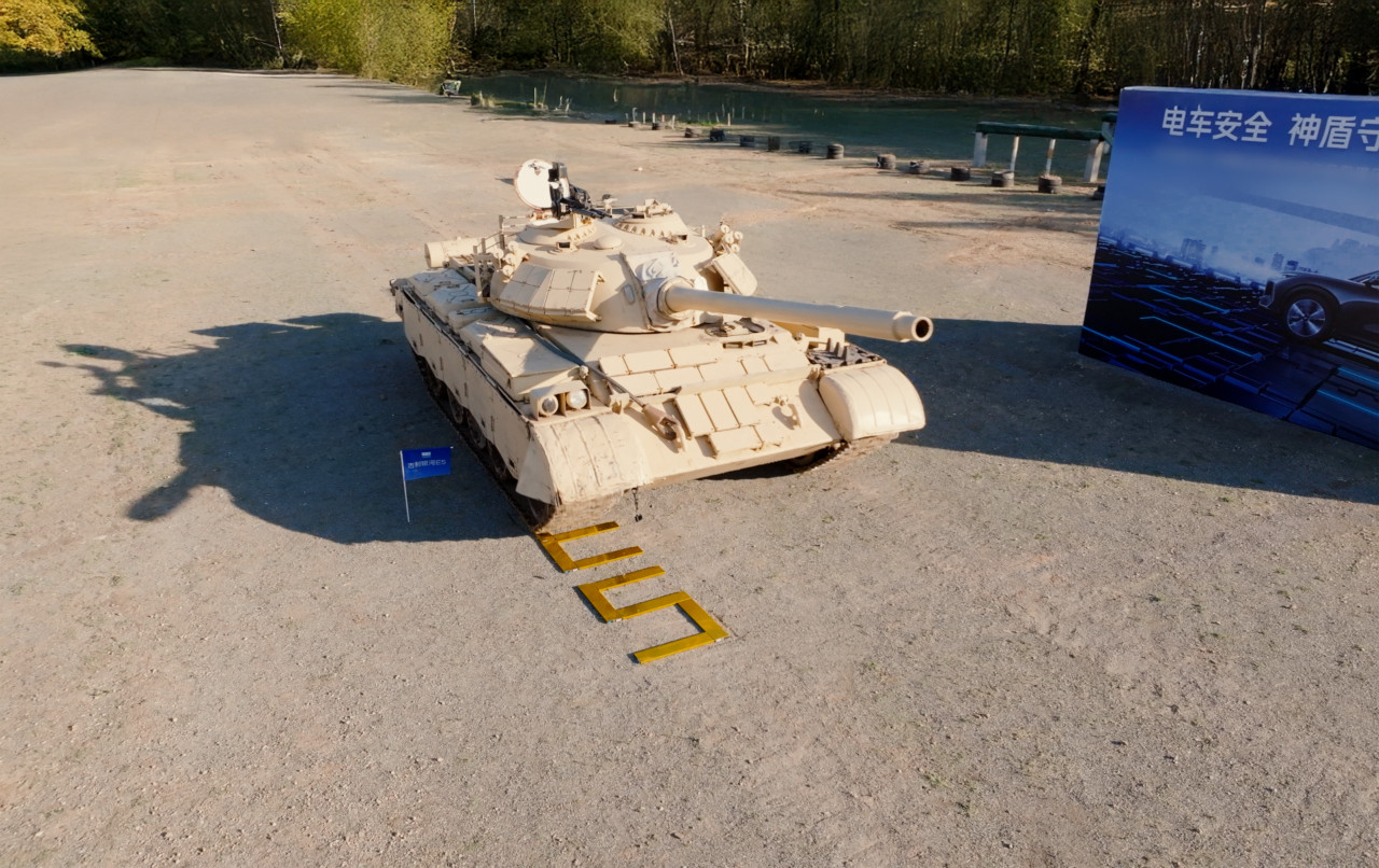 此次试炼模拟用户驾车遭遇极端外力冲击后,电池包受到底部剧烈撞击,电池受到外部传递的极端挤压的场景。一辆质量为36吨的ZTZ-59D中型坦克(简称“59D坦克”),以单边履带反复碾压2次神盾金砖电池包,再连续碾压1块及10块神盾金砖电池。