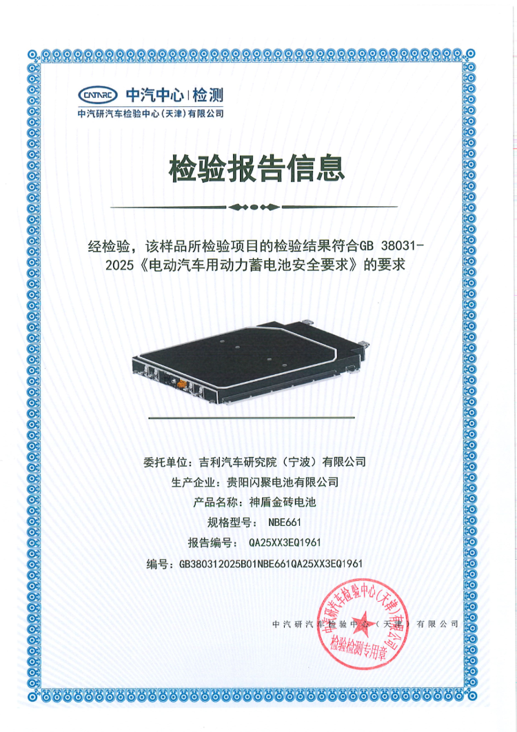 吉利神盾金砖电池及神盾电池安全系统,成功通过GB38031-2025《电动汽车用动力蓄电池安全要求》检测验证并获得检测报告,成为行业首批全系通过电池安全新国标认证的电池品牌。吉利银河E5作为吉利以全球化标准、全球化技术,为全球用户打造的高价值智能精品车,传承全球安全基因,其搭载神盾金砖电池,也已通过中汽中心认证的电池安全新国标认证,打造15万内电池安全新标杆。