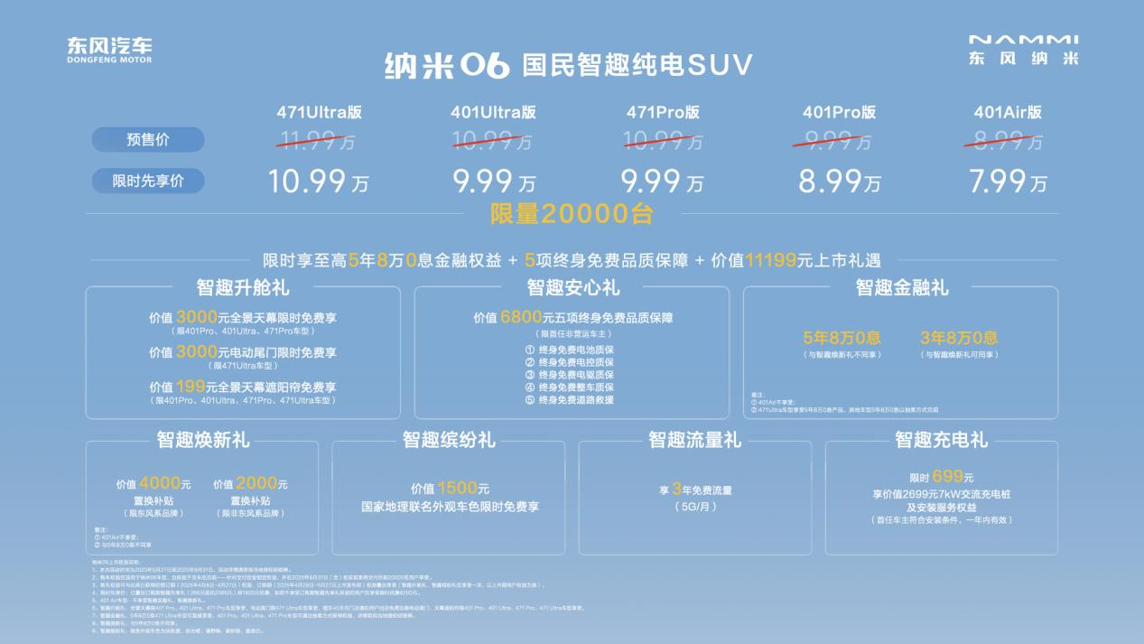 大可玩,尽情6。5月27日,东风纳米旗下“国民智趣纯电SUV”东风纳米06在武汉正式上市,限时先享价为7.99万元-10.99万元。作为一个听劝的品牌,东风纳米06为用户带来7大诚意权益,包括电动尾门和全景天幕限时送、五项终身免费品质保障、中国国家地理联名外观车色限时免费享、最高4000元置换补贴、至高享“5年8万0息”、送3年免费流量、699元享价值2699元充电桩及安装服务等众多的超有诚意权益。当产品超过期待、价格超出期待、品质越级领先,是给予用户最大的诚意,也是东风纳米赋能国民极致美好生活的最大底气。