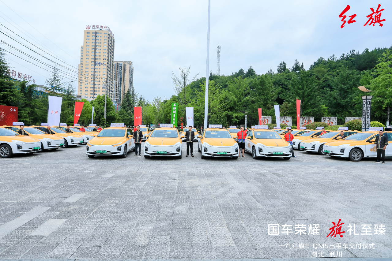 作为中国汽车工业的旗帜,红旗品牌始终肩负产业报国使命。面对新能源转型浪潮,红旗以技术创新驱动市场突破。此次300台E-QM5换电版成功交付利川,是红旗中南区深耕区域市场、抢抓出行领域战略机遇的关键成果,成功在鄂西地区插上红旗新能源出行的旗帜。 仪式现场,整齐列阵的E-QM5换电版出租车整装待发,即将成为服务利川市民、展示城市形象的“绿色流动名片”。